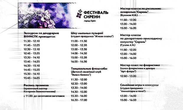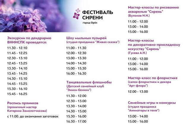 На них работники института расскажут о видах сирени, растущих в Орловской области.Помимо этого, как сообщает пресс-служба администрации Орловской области, для гостей будут проведены разнообразные развлечения: спортивные семейные игры, мастер-классы по флористике, рисованию акварелью и декоративно-прикладному искусству, а также шоу мыльных пузырей и фотосессии в цветах.