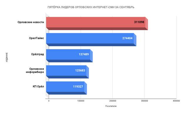 274,4 тыс. посетителей зашли на сайт ОрелТаймс в сентябре, чтобы прочесть актуальную информацию и аналитику. С этим результатом, по данным Liveinternet.ru, мы заняли вторую строчку в рейтинге региональных СМИ. Ну а первый результат – у «Орловских новостей». Что интересовало нашего читателя в первую очередь?