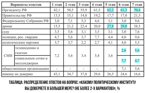 Важно понимать, что мир – не чёрно-белый, а, как минимум, калейдоскоп событий и оценок.Так или иначе, с февраля по сегодняшний день растёт уровень доверия к политическим институтам. Даже малопопулярные политические партии, полиция и федеральное собрание набрали в информационном весе. В то же время отношение к СМИ ухудшилось.
