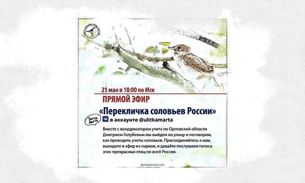 В Орле координатором акции стал известный фотограф-анималист и натуралист Дмитрий Голубев. Он же 21 мая в 18:00 проведёт прямой эфир «Перекличка соловьёв России» в группе «Улитка Марта» в социальной сети «ВКонтакте».