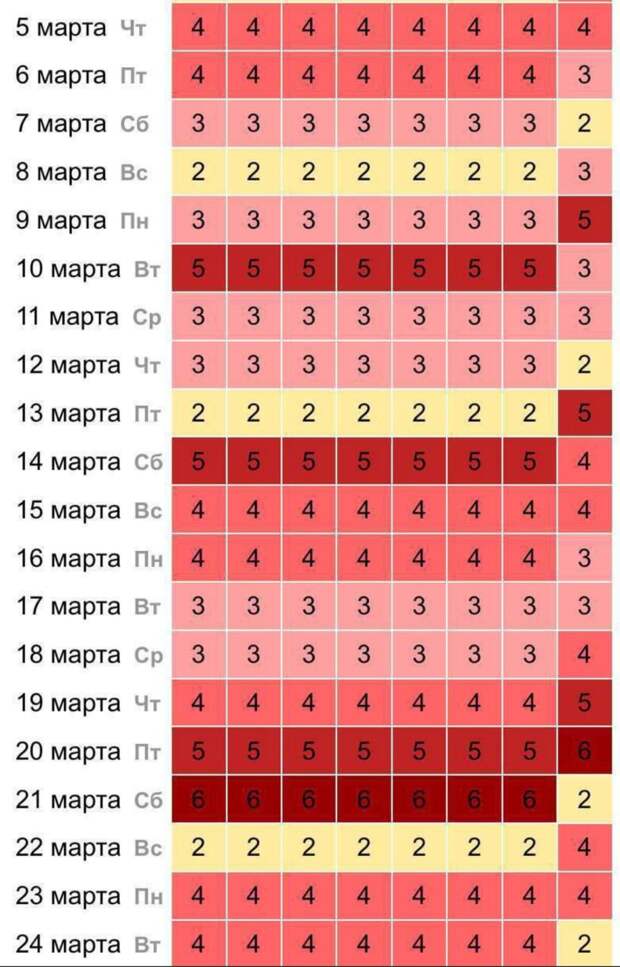 Напряжёнными днями, по данным Лаборатории солнечной астрономии ИКИ и ИСЭФ, будут 5, 6, 15, 16, 23 марта — в эти периоды прогнозируются бури силой до 4 баллов.