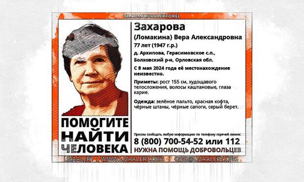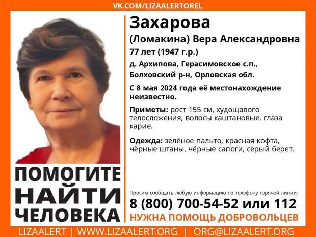 В Орловской области разыскивают 77-летнюю Веру Захарову (Ломакину). Пост-ориентировку разместил региональный поисковый отряд «ЛизаАлерт» на официальной странице ВКонтакте.