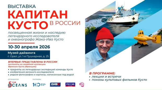 10 апреля в Орле откроется необычная выставка в регионе, рассказывающая о богатом наследии и жизни выдающегося французского исследователя океана Жак-Ива Кусто. Организаторами проекта выступили Клуб кругосветных путешественников «5 Океанов» и Россотрудничество.