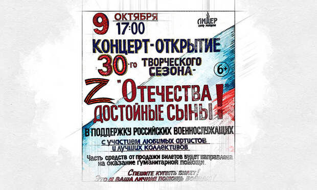 «Спешите купить билет! Это и ваша личная помощь бойцам!», — написано на афише, которую разместил Телеграм-канал «Принт-ТВ».