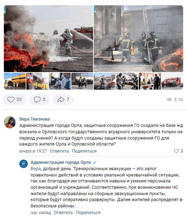 «Администрация города Орла, защитные сооружения ГО создали на базе вокзала и Орловского государственного аграрного университета только на период учений? А когда будут созданы защитные сооружения ГО для каждого жителя Орла и Орловской области?», — поинтересовалась орловчанка.