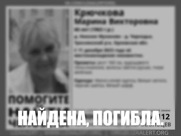 Орловчанка Марина Крючкова найдена сегодня, 19 декабря, мёртвой. Ориентировка на пропавшую женщину была распространена волонтёрами поисково-спасательного отряда «ЛизаАлерт».