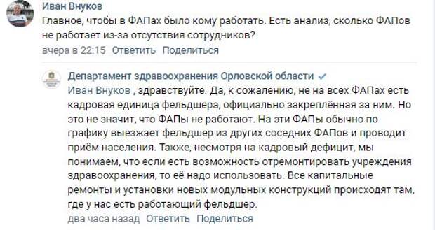 д. Правда, некоторые их них забраковала прокуратура: в частности, в мае 2023 года ведомство возбудило два уголовных дела о некачественном строительстве ФАПов в селе Хотьково Шаблыкинского района и в деревне Мураевке Сосковского района.Впрочем, как выяснилось из переписки орловца с региональным депздравом, уголовные дела — не единственная проблема. Ещё одна — дефицит медработников, которую ведомство признало.