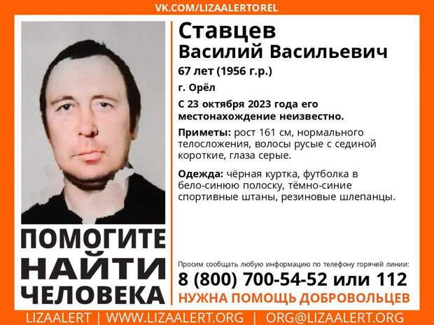 Как сообщили в поисковом отряде «ЛизаАлерт» Орловской области, Ставцеву 67 лет. Последний раз на связь он выходил 23 октября, с тех пор о нём ничего неизвестно.