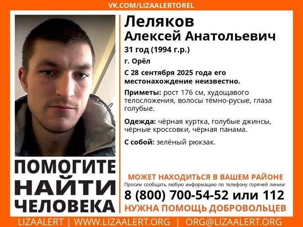 31-летний орловец ушёл из дома 28 сентября и не вернулся. Уже пятый день о местонахождении молодого человека ничего не известно.