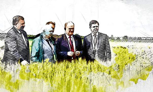 На поля Орловщины выехала представительная делегация: глава КПРФ Геннадий Зюганов, губернатор Андрей Клычков, гендиректор «Щёлково Агрохим» Салис Каракотов и сопровождающие их многочисленные лица.