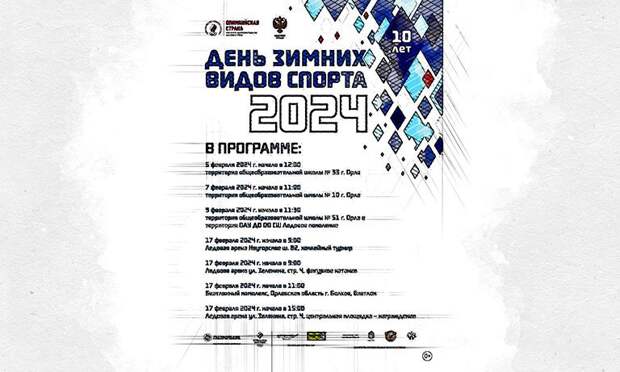 В городе Орле пройдёт двухнедельная серия мероприятий, посвящённых 10-летию Олимпийских игр в Сочи. Дни зимних видов спорта начнутся 5 февраля и завершатся 17-го.