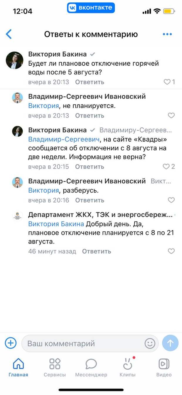 Заметим, что сначала отвечать орловчанке начал первый замгубернатора Ивановский, и его информация оказалась иной – изначально он сообщил, что отключать воду в областной столице не планируется. Когда же орловчанка решила уточнить, почему на сайте «Квадры» висит другая информация, чиновник ответил лаконично – «разберусь».