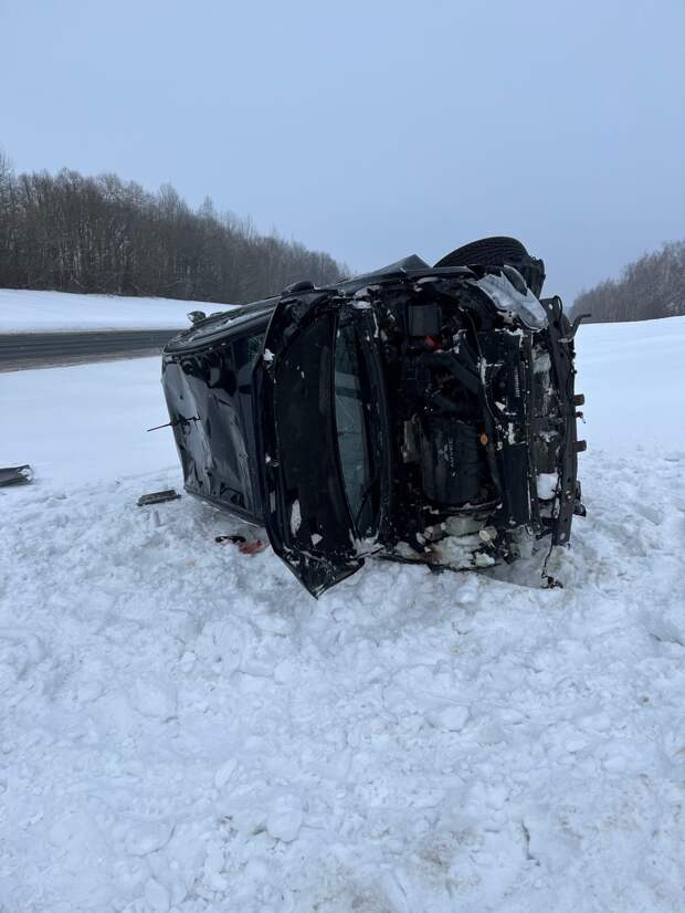 В этот момент по «встречке» ехал большегруз DAF с полуприцепом. Он и врезался в легковушку, которая вылетела с дороги и перевернулась.