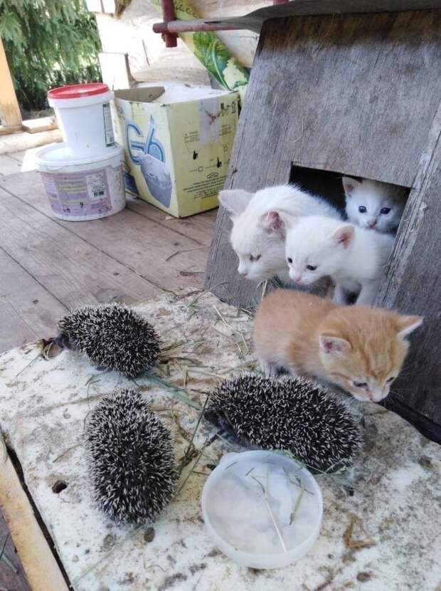 «Какой щупленький, но симпатичный лисёнок! Бегал в поисках еды», — сопроводил сообщением кадры автор видео. Впрочем, на прошедших выходных главным героем соцсетей стала семья кошек, которая приютила на воспитание маленьких ежат.