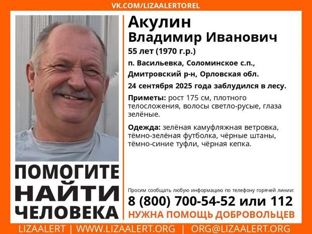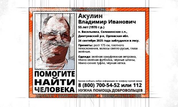 Волонтёры поискового отряда «ЛизаАлерт» Орловской области опубликовали клич о помощи. 24 сентября 55-летний Владимир Иванович Акулин пошёл в лес за грибами и не вернулся. Известно, что мужчина – уроженец посёлка Васильевка Дмитровского района.