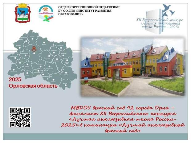 Детский сад № 92 города Орла одержал победу в заочном туре XII Всероссийского конкурса «Лучшая инклюзивная школа России – 2025». Учреждение стало лучшим в номинации «Лучший инклюзивный детский сад» и получило право участвовать в очном федеральном этапе.