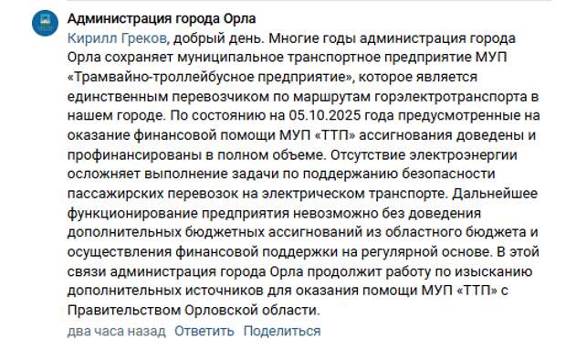 «Отсутствие электроэнергии осложняет выполнение задачи по поддержанию безопасности пассажирских перевозок на электрическом транспорте. Дальнейшее функционирование предприятия невозможно без доведения дополнительных бюджетных ассигнований из областного бюджета и осуществления финансовой поддержки на регулярной основе. В этой связи администрация города Орла продолжит работу по изысканию дополнительных источников для оказания помощи МУП «ТТП» с Правительством Орловской области», — указывается в ответе с аккаунта пресс-службы городской администрации.