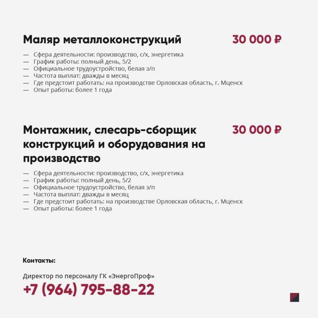Оплата – постоянная фиксированная часть + переменная часть от выполнения плана с учетом выработки + оплачиваемые переработки. Монтажник, слесарь-сборщик конструкций и оборудования на производство, г. Мценск, 30 000 ₽, Сфера деятельности: производство, с/х, энергетика, График работы: полный день, 5/2, Официальное трудоустройство, белая з/п, Частота выплат: дважды в месяц, Где предстоит работать: на производстве Орловская область, г. Мценск, Опыт работы: более 1 года, Монтаж оборудования и сборка инженерных систем блок-контейнеров, трубопроводных систем из низколегированных, нержавеющих сталей и полипропилена.