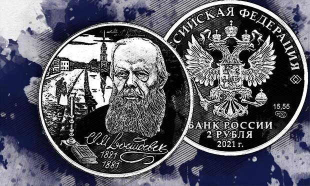 На лицевой стороне монеты расположено рельефное изображение Государственного герба РФ. На оборотной — изображения портрета Фёдора Михайловича Достоевского, свечи и книги на фоне выполненных в технике лазерного матирования вида Санкт-Петербурга и рукописного текста.