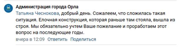 В центре города ёлок — огромное количество! Даже возле ЗАГСа поставили! А в Железнодорожном районе, получается, нет ни одной! Оставили нас без Нового года», — обратилась к региональному главе горожанка.Как пояснили в мэрии Орла, конструкция вышла из строя.