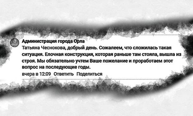 «Сожалеем, что сложилась такая ситуация. Ёлочная конструкция, которая раньше там стояла, вышла из строя. Мы обязательно учтём Ваше пожелание и проработаем этот вопрос на последующие годы», — указывается в ответе с аккаунта пресс-службы городской администрации. Отметим: срок эксплуатация ели, которую традиционно устанавливают на площади Мира, закончился ещё в 2024 года. Почему власть не учла этого при подготовке к украшению города в текущем году — вопрос.