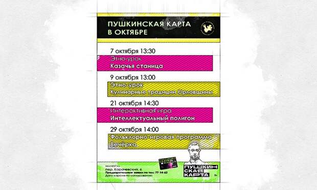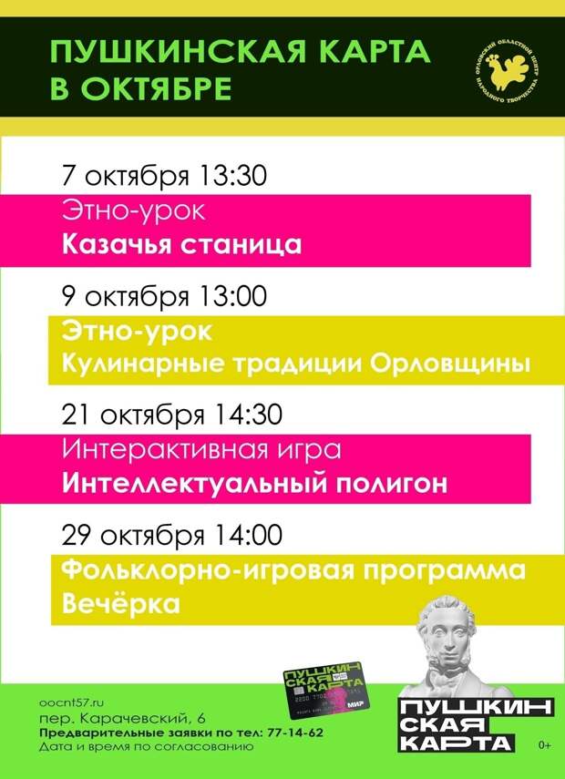 Орловский областной центр народного творчества опубликовал афишу на октябрь. В планах – четыре необычных мероприятия. Посетить их могут как взрослые, так и дети. Выгоднее всего – студентам. Мероприятия доступны по программе «Пушкинская карта».