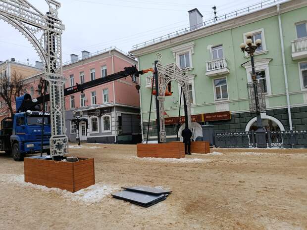 На площади Ленина пока ещё стоят ёлка и огромные Дед Мороз со Снегурочкой, но на улице Ленина уже приступили к уборке новогодних арок.