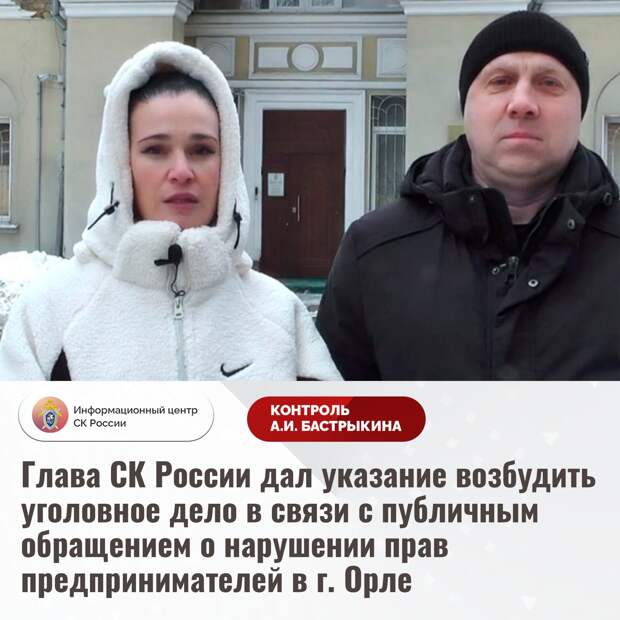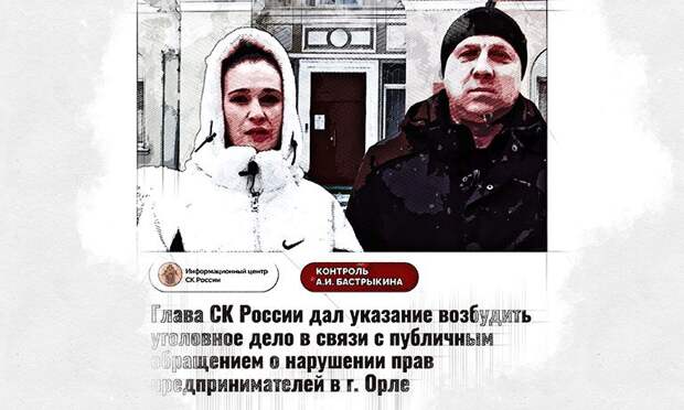 Глава Следственного комитета России Александр Бастрыкин дал указание возбудить уголовное дело в связи с публичным обращением о нарушении прав предпринимателей в Орле.