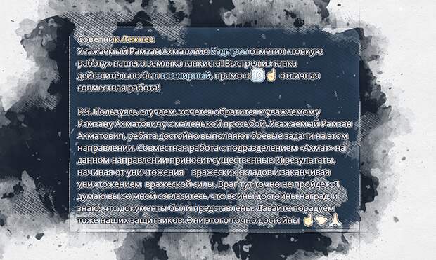 Выстрел из танка действительно был ювелирный, отличная совместная работа! Пользуясь случаем, хочется обратится к уважаемому Рамзану Ахматовичу с маленькой просьбой . Я думаю вы со мной согласитесь, что воины достойны наград, и знаю, что документы были представлены. Давайте порадуем наших защитников», — написал Лежнев. Отметим, не ясно о какой награде говорит советник, но раз обращается к Кадырову, значит, ходатайствует о Чеченской регалии.Отметим: ранее советник опубликовал видео, на котором танковый экипаж под командованием бойца из Орловской области уничтожил вражескую цель на Харьковском направлении. Позже данное видео разместил у себя в канале глава Чечни Рамзан Кадыров, подписав: «В результате точного удара укрепрайон ВСУ разлетелся на мелкие щепки . Тонкая работа».