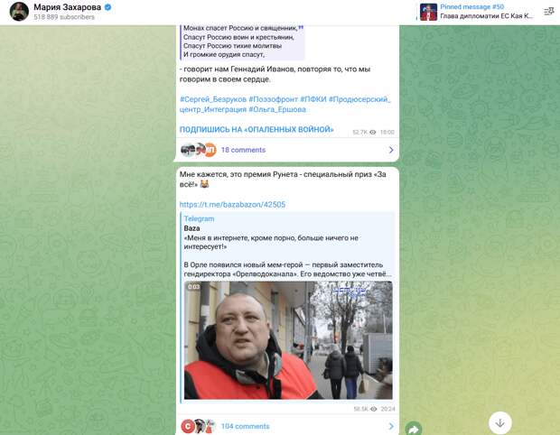 «Мне кажется, это премия Рунета — специальный приз «За всё!»», — отметила дипломат в своём официальном телеграмм-канале», сопроводив запись смеющимся до слёз смайликом. Отметим: речь идёт о вирусном видео, на котором Терновых, отвечая на вопрос журналиста «Истоков» о недовольстве орловцев из-за аварии на канализационном стоке, заявляет, что в Интернете ему интересно только порно. Видео: «Истоки»