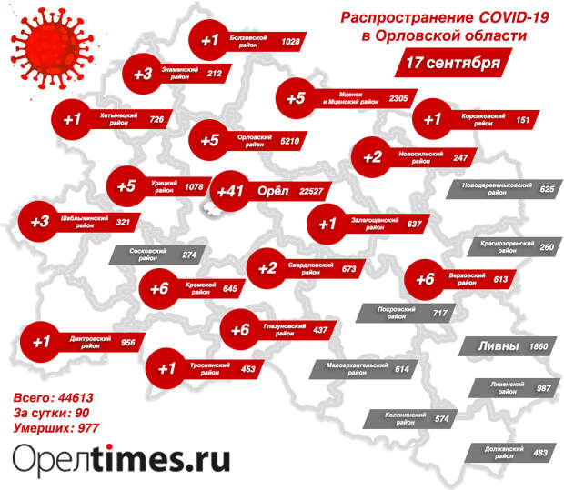 Число заболевших COVID-19 в Орловской области снова растёт. Если в первой декаде сентября специалисты выявляли до 80 случаев, то по состоянию на 17 сентября суточный прирост заболевших составил 90 человек. Такие данные приводит Стопкоронавирус.рф.