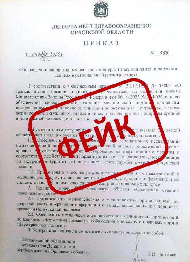 Всё это якобы происходит на основе решения депздрава.«Такого документа не было, это фейк», — сообщает правительственный тг-канал «ТЕЛЕГРАММЫ ИZ ОРЛА».