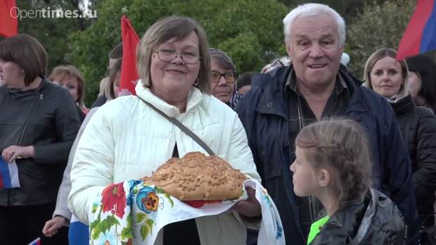 Оператор ОрелТаймс снял вышедших орловцев с хлебом-солью, российскими флагами и цветами.