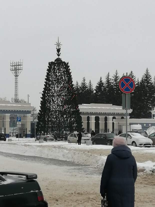 У ели странная макушка, украшенная звездой. Сама ёлка выглядит голо – между ветвями огромные дыры, напоминающие решето.