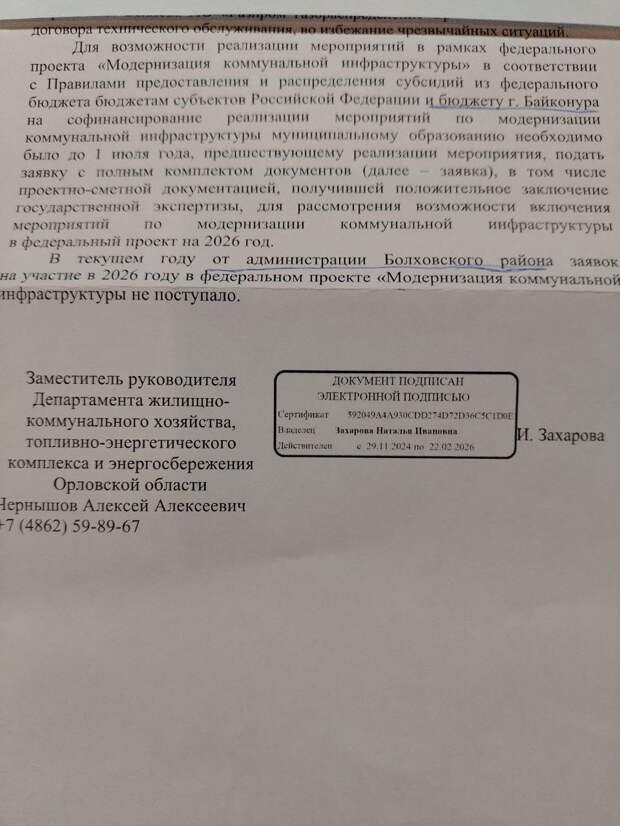 «В соответствии с правилами представления и распределения субсидий из федерального бюджета бюджетам субъектов Российской Федерации и бюджету города БАЙКОНУРА, на софинансирование реализации мероприятий по модернизации коммунальной инфраструктуры муниципальному образованию необходимо было до 1 июля года, предшествующему реализации мероприятия, подать заявку с полным комплектов документов… на 2026 год».