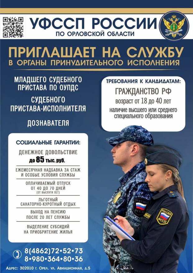 – Более подробная информация, в том числе перечень необходимых документов, размещены на официальном сайте УФССП России по Орловской области. По всем вопросам трудоустройства обращаться в отделение государственной службы и кадров Управления Федеральной службы судебных приставов по Орловской области по номеру телефона: 8 (4862) 72-52-73, 8 980-364-80-36, – сообщает пресс-служба ведомства.