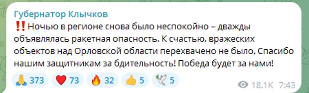 «Ночью в регионе снова было неспокойно – дважды объявлялась ракетная опасность. К счастью, вражеских объектов над Орловской области перехвачено не было. Спасибо нашим защитникам за бдительность!
