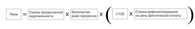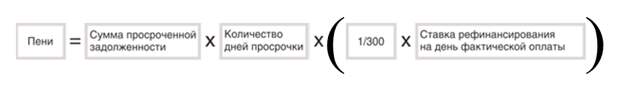 Пени могут начисляться, если просрочка платежа составляет более 1 месяца. Для выставления пеней, должнику достаточно не платить 1 месяц. С этого момента начинается начисление пеней. Первые 90 дней можно назвать льготными, когда пени равны 1/300 ставки рефинансирования ЦБ РФ. По истечении 90 дней размер пени увеличивается и составляет 1/130 ставки рефинансирования ЦБ РФ. Формула для начисления пеней следующая: (ч. 14 ст. 155 ЖК РФ; п. 159 Правил, утв. Постановлением Правительства РФ от 06.05.2011 N 354):