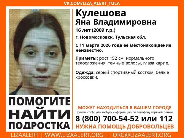 16-летняя Яна Кулешова ушла из дома больше недели назад. С 11 марта о её местонахождении ничего не известно. Близкие обратились за помощью в поисковый отряд «Лиза Алерт».