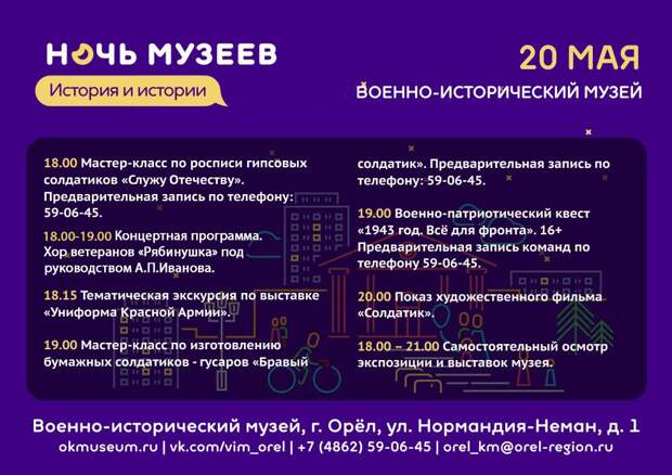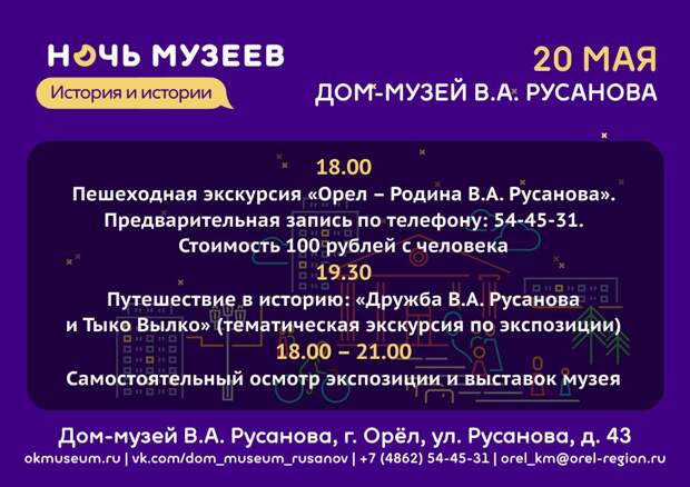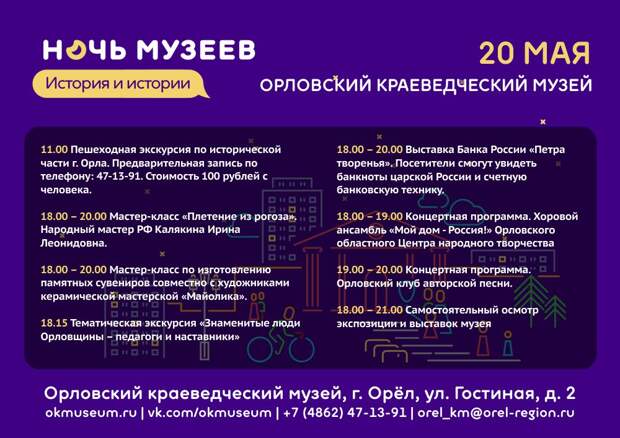В рамках акции будут проведены мастер-классы по народному творчеству, экскурсии по городским объектам и музейным выставкам, концертные программы, квест-игра для взрослых» – сообщили в «Орловском краеведческом музее». Несмотря на программу, на «Ночь музеев» орловское действо претендует с натяжкой.