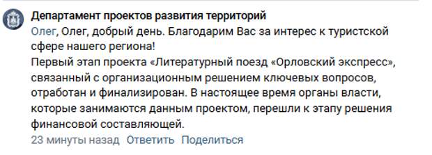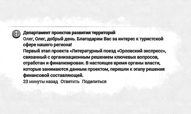 «Первый этап проекта «Литературный поезд «Орловский экспресс», связанный с организационным решением ключевых вопросов, отработан и финализирован. В настоящее время органы власти, которые занимаются данным проектом, перешли к этапу решения финансовой составляющей», — указывается сообщении профильного ведомства.