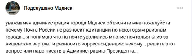 «Уважаемая администрация города Мценск, объясните мне пожалуйста, почему «Почта России» не разносит квитанции по некоторым районам города? Я понимаю, что на почте уволились многие почтальоны из-за нищенских зарплат и разносить корреспонденцию некому, но решите этот вопрос. Или надо писать в Администрацию Президента?», – написал местный житель Константин Гусев в паблике «Подслушано Мценск». На этот пост откликнулись представители власти. Комментарий дал официальный аккаунт Орловской области в соцсетях. Как выяснилось, причина того, что жителям города не приносят квитанции кроется не в кадровой проблеме, а в чём-то другом.