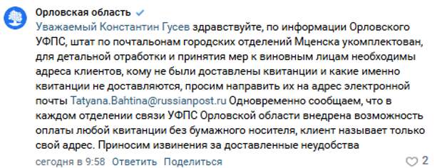 «По информации Орловского УФПС, штат по почтальонам городских отделений Мценска укомплектован, для детальной отработки и принятия мер к виновным лицам необходимы адреса клиентов, кому не были доставлены квитанции и какие именно квитанции не доставляются, просим направить их на адрес электронной почты Tatyana.Bahtina@russianpost.ru Одновременно сообщаем, что в каждом отделении связи УФПС Орловской области внедрена возможность оплаты любой квитанции без бумажного носителя, клиент называет только свой адрес. Приносим извинения за доставленные неудобства», – сообщили чиновники.
