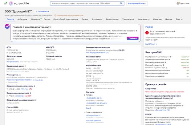 Компания, зарегистрированная в Орле, работала с 2015 года в сфере строительства жилых и нежилых зданий. С момента основания генеральным директором являлся Алексей Минаков, который также выступает единственным владельцем 100% долей. Согласно данным портала rusprofile.ru, по состоянию на 23 ноября 2025 года у ООО «Дорстрой 57» в залоге находятся 12 объектов имущества.