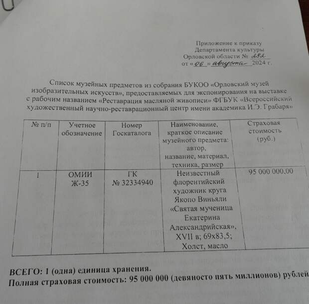 «Они страхуют эту работу, т.к. они заинтересованные лица. Вот, к примеру, посмотрите какая страховая оценка была за одну из работ: 95 млн рублей. И где здесь рубль?», – возмущённо заявила Светлана Анатольевна, демонстрируя нам приказ на выдачу во временное пользование одной из картин музея. В 2024 году в другие регионы отправилось лишь несколько картин (не 500 и не 600, как предполагал Верижников). Так, к примеру, Всероссийский художественный научно-реставрационный центр имени И.Э. Грабаря на время забрал картину «Святая Екатерина Александрийская» неизвестного флорентийского художника круга живописца Якопо Виньяли. Третьяковская галерея заинтересовалась работой П.П. Осовского «Велосипедисты» – полотно из орловского музея украшало выставку «Век спорта. К 100-летию московского спорта». На днях музей импрессионизма забрал «Портрет Поля Мака» автора Натальи Гончаровой. Откуда взялся «рубль раздора»?