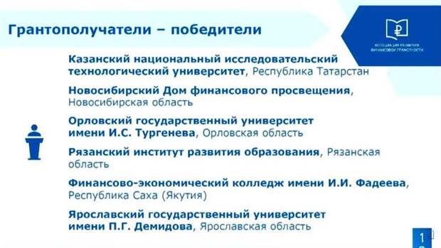 Ярославский государственный университет имени П. Г. Демидова (Ярославская область). Целью конкурса, в котором приняли участие 52 организации из 36 субъектов Российской Федерации, по словам руководителя АРФГ Вениамина Каганова, было выявление и оказание содействия в развитии ресурсных волонтёрских центров финансового просвещения и в повышении финансовой грамотности на территории Российской Федерации.