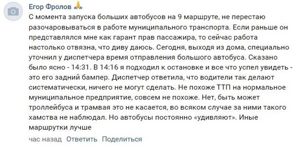 Если раньше он представлялся мне гарант прав пассажира, то сейчас его работа настолько отвязна, что диву даюсь. Сегодня, выходя из дома, специально уточнил у диспетчера время отправления большого автобуса по маршруту №9. Сказано было ясно: 14:31. В 14:16 я подходил к остановке и всё, что смог увидеть — это его задний бампер. Диспетчер сообщила, что водители так делают систематически, ничего не могут поделать», — сообщил орловец. Фото: «Общественный транспорт Орла»Мнение автора поста разделили множество орловцев, которые подтвердили, что за время курсирования ЛиАЗов по Орлу так и не смогли понять график их движения. Одни видят в этом борьбу за трафик с частниками, другие убеждены, что дело в организации графика работы водителей. Этот вопрос, как сказано в комментариях, способен решить грамотный специалист. Более того, в процессе диалога выяснилось, что таковой уже есть: «на работу приняли нового руководителя отделом расписания», — сообщил один из подписчиков паблика.