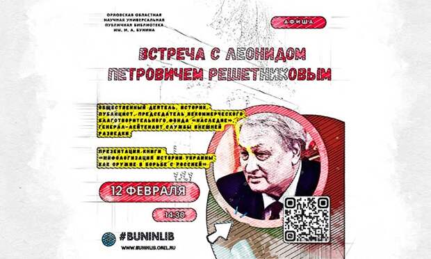 Орловская областная библиотека имени И.А. Бунина организует встречу с российским общественным деятелем, историком, публицистом генерал-лейтенантом Службы внешней разведки РФ Леонидом Решетниковым. Главной темой встречи станет развенчание украинской военной пропаганды.