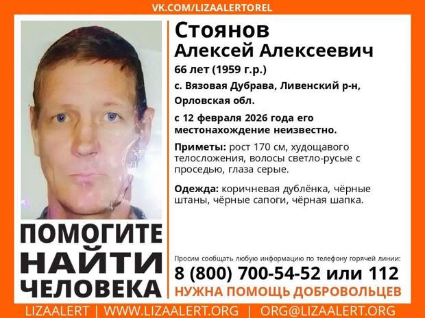 В момент исчезновения был одет в коричневую дублёнку, чёрные сапоги, чёрные штаны и чёрную шапку. Приметы: рост 170 см, худощавое телосложение, светлые волосы с проседью, серые глаза. Нужна помощь добровольцев. Если вам не равнодушна судьба нашего земляка – свяжитесь с поисковиками «ЛизаАлерт». Если вы видели человека, похожего на Алексея Стоянова, или знаете, где он может находиться – оперативно сообщите в службу спасения или поисковый отряд.