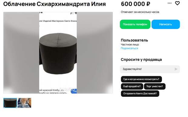 В Орле на продажу выставили облачение почившего батюшки Илия. За монашеский клобук, который принадлежал схиархимандриту, продавец хочет получить 600 тыс. рублей. Новостью с редакцией поделился читатель ОрелТаймс. Орловцы поинтересовались у продавца, подлинная ли вещь? Получив положительный ответ, потенциальные покупатели спросили, как вещь оказалась у Ивана (продавца с Авито).